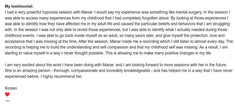 Karlie recently had a hypnotherapy session with me and coaching, and she wanted to share just how deeply the experience impacted her. According to Karlie, the session brought a noticeable shift in her life — one that she’s still feeling the effects of. What stood out most for Karlie was how deeply she was able to access her subconscious mind — far deeper than she’d ever reached through meditation or other self-work.