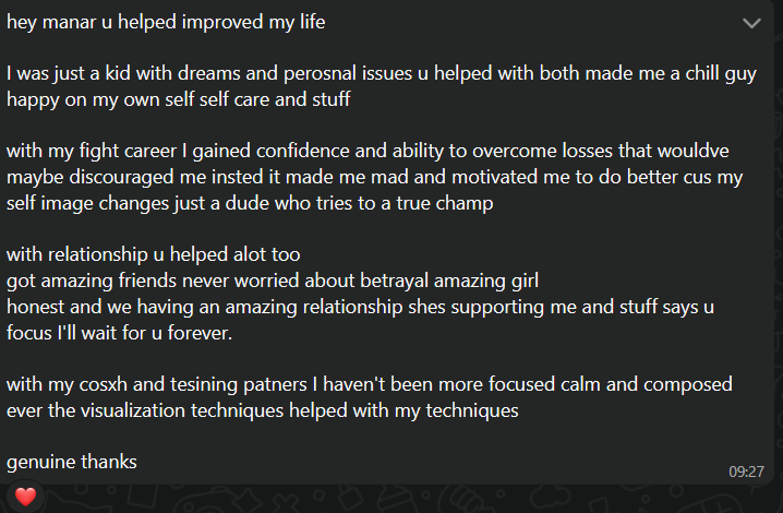 Before the sessions, Atharva struggled with low confidence and performance anxiety under pressure, despite knowing he had the skills. After just one hypnotherapy session and 2 coaching sessions, everything changed. He now feels more relaxed, focused, and confident in his abilities — both inside and outside the ring. Atharva has been crushing it ever since, winning a lot of fights from the first rounds. Less than a year later, he's a proud owner of the purple belt.. and he's just getting started..